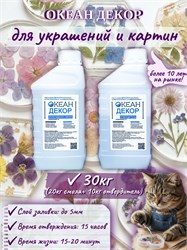 ОКЕАН ДЕКОР (средняя вязкость , прозрачная, время жизни 25 мин, предназначена для мелких заливок до 2см в художественных целях. Твердеет через 15-20ч при добавлении красителей цветовые пятна не сильно расплываются. Отличный вариант для объемного рисования, для заливки мелких трещин в дереве и бетоне, тонкослойных заливок в молды.